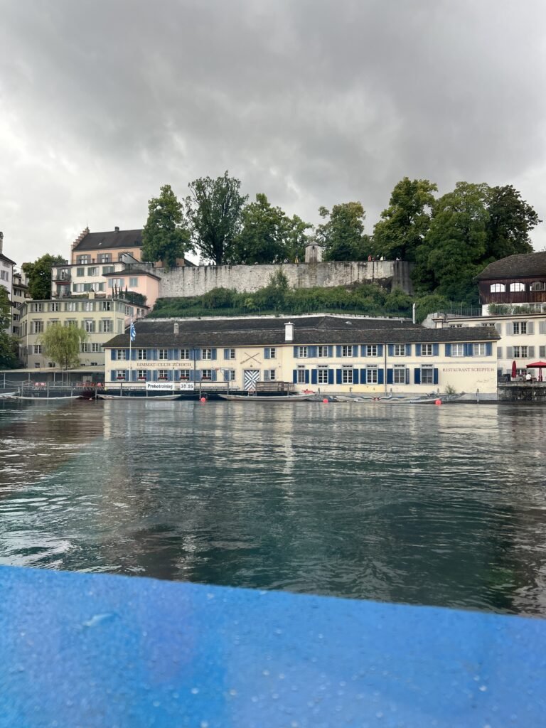 Allerdings hielt das Glücksgefühl vor Ort nicht lange an. Den Mädchen wurde jetzt so richtig bewusst, was es hieß, dass sie in der Schweiz ihre mobilen Daten aufgrund der hohen Zusatzkosten nicht nutzen durften und ich nicht bereit war, nonstop einen Hotspot zu Verfügung zu stellen. Und Petrus war diesmal absolut nicht auf unserer Seite; es regnete Bindfäden. Wir ließen uns davon erst einmal nicht abschrecken, schlossen unsere Koffer für 12 CHF (für maximal 6 Stunden) in eins der XXL-Schließfächer am Hauptbahnhof und begaben uns zur Bootshaltestelle Landesmuseum, wenige Meter von Bahnhof entfernt. Von dort aus fuhren wir insgesamt 55 Minuten ein Stück die Limmat und den Zürichsee auf und ab. Dank des Swiss Travel Pass hatten wir mit dem Boot sowie nahezu allen Zug-, Bus- und Bahnverbindungen freie Fahrt. Bei schönem Wetter ist so eine Schifffahrt bestimmt eine wunderschöne Sache, bei strömendem Regen eher ziemlich unspektakulär – aber immerhin sitzt man im Trockenen.
