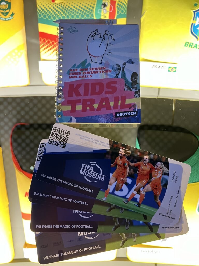 Am nächsten Morgen sah es wettertechnisch leider nicht besser aus und wir entschieden uns für das FIFA-Museum, eins von 500 Schweizer Museen, die man mit dem Swiss Travel Pass kostenlos besuchen kann. Hier schlugen nicht nur die Herzen der Fußballfans höher, auch die etwas weniger Fußballverrückten können hier viel lernen und erleben. Direkt am Eingang erhalten die Kinder ein kleines Büchlein mit insgesamt 19 Rätseln, die im gesamtem Museums-Areal gelöst werden können. Bei erfolgreicher Suche nach dem Lösungswort nimmt man zusätzlich an der Verlosung eines Museumsballes teil. Neben den üblichen Infowänden gibt es auch allerlei interaktive Stationen: man kann die Sequenz eines Fußballspieles synchronisieren und aufzeichnen lassen, eine Fußballparcours mit insgesamt sechs Stationen bespielen, ein „Jubel“-Selfie mit einem seiner Lieblingsspieler der eFIFA schießen oder ein Grußfoto aus einem der bekanntesten Stadien der Welt machen lassen. Alles in allen hatten wir einen sehr kurzweiligen und spannenden dreistündigen Aufenthalt bei der FIFA.
