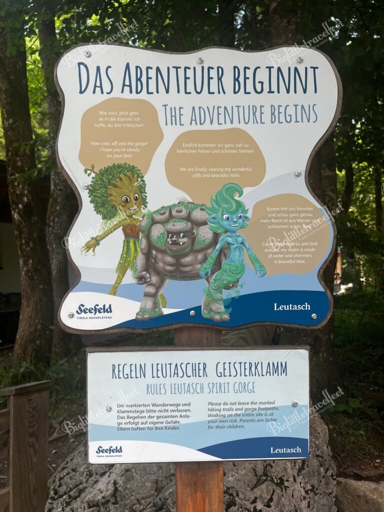 Danach ging’s in die Leutascher Geisterklamm – wild, laut, spektakulär. Die Kinder waren begeistert, wir auch. Und endlich: kein Regen! Auf gut 1,5 km findet man rund 40 Stationen der drei Klammgeistern zum Lernen, Entdecken und Erleben. So wird auch den lauffaulen Kids nicht langweilig. Fun fact: mitten im Wald findet man die Deutsch-Österreichische Landesgrenze!